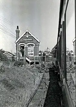 The station is near Knockmore Junction, which came into service in 1863 for the Banbridge, Lisburn and Belfast Junction Railway (BLB) to connect with the Ulster Railway.[1] The junction gained another branch in 1871 when the Dublin and Antrim Junction Railway (D&A, now the Lisburn–Antrim railway line) was opened.[1] The Ulster Railway, BLB and D&A all became part of the GNR by the end of the 1870s.[2] A halt was finally provided at Knockmore Junction in 1932, but it did not last long and was closed a year later. The GNR was nationalised in 1953 as the GNR Board,[3] which closed Banbridge branch on 29 April 1956.[4]