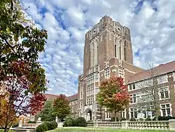 The first people to form substantial settlements in what is now Knoxville were indigenous people who arrived during the Woodland period (c. 1000 B.C. to 1000 A.D.).[22] One of the oldest artificial structures in Knoxville is a burial mound constructed during the early Mississippian culture period (c. 1000–1400 A.D.). The earthwork mound has been preserved, but the campus of the University of Tennessee developed around it.[23]