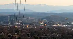 According to the United States Census Bureau, the city has a total area of 104.2 square miles (269.8 km2), of which 98.5 square miles (255.2 km2) is land and 5.6 square miles (14.6 km2), or 5.42%, is water.[70] Elevations range from just over 800 feet (240 m) along the riverfront to just over 1,000 feet (300 m) on various hilltops in West Knoxville,[71][72] with the downtown area setting at just over 900 feet (270 m).[73] High points include Sharp's Ridge in North Knoxville at 1,391 feet (424 m) and Brown Mountain in South Knoxville at 1,260 feet (380 m).[74][75]