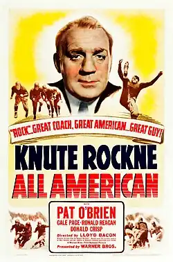Knute Rockne, All American is a 1940 American biographical film that tells the story of Knute Rockne, Notre Dame's legendary football coach. It stars Pat O'Brien as Rockne and Ronald Reagan as player George Gipp, as well as Gale Page, Donald Crisp, Albert Bassermann, Owen Davis Jr., Nick Lukats, Kane Richmond, William Marshall, and William Byrne. The film also includes cameos by football coaches "Pop" Warner, Amos Alonzo Stagg, William H. Spaulding, and Howard Jones, playing themselves. It also has a cameo by Olympic star Jim Thorpe.