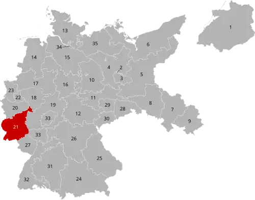 It comprised the Regierungsbezirke of Koblenz and Trier from the Rhine Province within the Free State of Prussia and the Landesteil Birkenfeld from the Free State of Oldenburg. It was constituency 21 in the numbering scheme.[1]