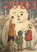 In 1927, Takeo Takei organized a group of illustrators at Kodomo no kuni and co-founded Nihon Dōga Kyokai or the Japan Association of Illustration for Children.[13] Core members of the group included Takei, Shiro Kawakami, Yoshio Shimizu, Kiichi Okamoto, Shōzō Fukazawa, Tomoyoshi Murayama, and Shigeru Hatsuyama, whose distinctive geometric style brought popularized abstraction at the publication.[14] The group was the first of its kind in Japan, specifically organized to further the artistic quality of children's art and illustrations.[10] Nihon dōga kyokai was dissolved in 1941 as a result of wartime policies.[15]