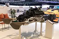 The Internal Combustion Engine (ICE) is a mid-rear mounted, in-house developed, twin-turbocharged V8 engine with a 5.0-litre displacement. It has four valves per cylinder, each with a bore and stroke of 92 mm × 95.25 mm (3.62 by 3.75 inches) and a compression ratio of 9.3:1. The engine utilizes dry sump lubrication and dual overhead camshafts, and has a cylinder bank angle of 90º.[23] It is rated at 820 kW (1,100 hp; 1,115 PS) at 7,800 rpm and 1,280 N⋅m (944 lb⋅ft) of torque at 4,100 rpm on 95 octane RON gasoline. A flex fuel sensor is installed in the fuel tank to detect E85 biofuel, which increases the power output to 1,120 kW (1,500 hp).[24] The ICE is rev-limited at 8,250 rpm.[25]