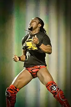 On the October 19, 2009 episode of Raw, Kingston spoke without a Jamaican accent during a televised segment, dropped the Jamaican character and began being billed from his home country of Ghana.[54][55] At Bragging Rights, Kingston wrestled as part of the Team Raw, which lost the match after Raw teammate Big Show betrayed them by chokeslamming Kingston, allowing Chris Jericho to pin Kingston to pick up the win for Team SmackDown.[56] After Kingston interfered in a match between Randy Orton and John Cena for Cena's WWE Championship match,[57] Orton and Kingston feuded, including a 5-men Survivor Series team against each other where Kingston's team won after he was the sole survivor, last eliminating Orton.[58] and TLC: Tables, Ladders & Chairs,[59] where Orton defeated Kingston.[60] They also participated in a triple threat match which included John Cena to determined a challenger for the WWE Championship at the Royal Rumble, which was won by Orton, who pinned Kingston.[61] Around a week earlier, on the January 4, 2010 episode of Raw, Kingston botched the finish of a match with Orton, and kept getting up despite the plan having been to take a punt kick on the ground from Orton. Orton was reportedly insulted by this, delivered a stiff RKO, and Kingston reportedly had a push stopped following complaints from Orton. He would remain a mid-carder for the next decade.[62][63][64][65] He competed in the Elimination Chamber match for the WWE Championship at Elimination Chamber, but was eliminated by the champion Sheamus. At WrestleMania XXVI, Kingston was unsuccessful in the Money in the Bank match, which was won by Jack Swagger.