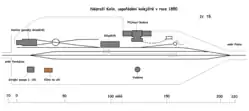 The reception building was built of bricks, the one-storey center of which was adjacent to two ground-level wings. It was 25 fathoms long, 6 wide. The roof of the building was covered with an English slate. Towards the track area there was a ground-floor annex that was covered with sheet metal. On the ground floor of the building was an engineer's office, a post office, a shelter of the pump servicer, the dispatcher and switchman flats. In the annex there was a waiting room with a cash desk. The original reception building survived at the same place for about 85 years, though it did not serve the original purpose later. Opposite the reception building behind the rails, a water tower was built with 5 fathoms deep well. From there the hand pump pumped water into the tank in the tower. The water was then led to two water cranes, from which the steam locomotive was pumping water. A steam pump was located in Pardubice. At the station, a carriage house was also built for two backup machines with a length of 20 and a width of 6 fathoms. However, this house was soon replaced by a warehouse.