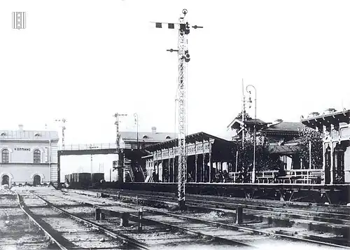 Kolpino station was opened on 9 May 1843 with the construction of the first in Russian Empire double tracked Saint Petersburg–Moscow Railway. The first station building was one-storey and wooden. The station was rebuilt in the early 1890s and was reopened on 1 September 1893. The central part was decorated with wood carving. There were extensions, which housed the First Class and Second Class waiting rooms and the station-master's office. Telegraph station occupied one of the rooms.[3]