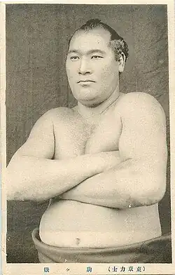 Born on December 13, 1880, in Miyagi Prefecture, he was introduced to sumo by Izutsu (yokozuna Nishinoumi Kajirō) when a group led by Konishiki and Asashio Tarō came on a tour in his hometown in 1897. He was promoted in juryō in the January 1902 tournament, and in May 1903 he entered the makuuchi division. Komagatake had a rivalry with Tachiyama Mineemon since their joint makushita debut. Their matches are said to have been particularly popular, to the point that their period of rivalry gave its name to this era, therefore known as the "Koma-Tachi era".[2] Komagatake was promoted to komusubi in January 1905 and sekiwake in May of the same year. He later earned the nickname Enma no Shiokara (閻魔の塩辛), meaning 'Enma's salted fish' after a Japanese saying comparing bitter grins to the difficult face of Enma, who chewed on a bug as if he had tasted salted fish.[2] Komagatake competed with Tachiyama for promotion to ōzeki and was promoted before him in the January 1907 tournament. Hitachiyama Taniemon took particular care of Komagatake and trained him diligently.