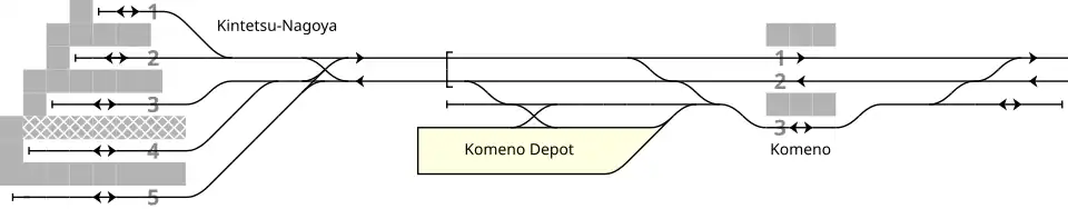 Komeno Station has a side platform and an island platform serving three tracks on the ground, and the entrance is located in the north of Nagoya-bound platform, connecting to Kuwana-bound one with a level crossing. Track 3 is not for embarking or disembarking passengers but for chartered trains, deadhead trains and trains entering or leaving Tomiyoshi Inspection Komeno Branch Depot.