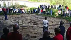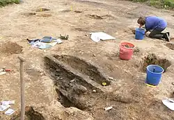 Archaeologists believe that there was a precursor to the Viking community Kungahälla which was located just south of Ytterby, and that this community was located on the lands of today's Ytterby near the great burial ground of Västra porten/Smällen.[8][9][10] In Ytterby, archaeologists have found remains of several buildings from the Iron Age built between 500 BC. and 600 AD. Of these, the largest is a hall building that was 48 meters long and 10 meters wide. This type of building belonged to the upper classes of society and the find may be the first find of a hall building from the migration period in Bohuslän, since the building was built between 400 and 600 AD.[11] The found of the remains of the hall building is believed to be a precursor to the royal estate that is mentioned in several sources, including in Njáls saga from the 13th century.[12] King Olav II Haraldsson of Norway, later known as Saint Olav, is said to have spent a year on these lands waiting for the inhabitants of Kungälv to complete his fleet before sailing to the Faroe Islands to demand taxes. The royal hall building was also occasionally inhabited by kings Olav Tryggvason, Harald Hardrada as well as other kings and magnates.[13]