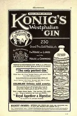 Konig's Westphalian Gin was a Steinhäger gin produced up to the early part of the twentieth century from malt, juniper berries and mineral water at H. C. König's distillery in Steinhagen, Westphalia, Germany. Steinhäger was first produced in 1640.[1]
