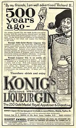 In common with other contemporary gins,[7] König's was sold in tall stoneware (steingut) bottles, and Konig's was given a red seal in an attempt to make it distinctive. The gin was widely advertised in yearbooks of the period such as The Stage Year Book and the Royal Colonial Institute Year Book and in magazines like The English Illustrated Magazine.