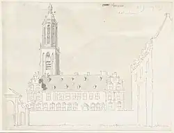 In 1629, Frederick V acquired a former monastery on the west side of the city, next to the Cunera Church.[2] The building was quickly demolished, and he commissioned Bartholomeus van Bassen to design a new palace, which was constructed between 1630 and 1631.[2][1] The palace was a two-storey main building, thirteen windows wide (approximately 40 metres), with two wings projecting to the south.[2][1][3] It was surrounded by large gardens.[2][1]
