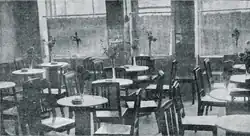 In 1920, part of the first floor was rented out by Richard Conrad's brothers Leonidas Konradas and Maksas Konradas, who established a cafe and sugar shop.[5] At that time, the cafe had two rooms. Rooms in the building were also rented by Valentinas Stabačinskas's clothing and hat workshop, and the hotel "Kęstutis" (not to be confused with Agota Samulytė's hotel "Kęstutis", which operated since 1919) was located on the second floor. The cafe experienced its first reconstruction in 1923, during which new furniture was bought. In the courtyard of the building's first floor there was also a bakery and four-room apartment owned by Maksas Konradas. The yard also contained one more brick and one wooden one-story house with apartments and ice cream parlor. In 1931 the building was connected to the city's sewage system, after which the cafe experienced a mild room expansion. In 1933, the cafe went into bankruptcy and its owners changed. Another renovation occurred in 1936, where the cafe was expanded outside for the summer season.[6]
