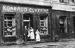 ![]() Maksas Konradas (Max Conrad) (left) and waitresses in front of the Konradas sugar shop (Konrado cukrainė) | |