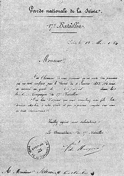 During his time in Paris, on 15 March 1854, Konstanty Schmidt-Ciążyński was appointed corporal of the 8th company of the 17th battalion of the Seine Department National Guard (French: Garde Nationale de la Seine).[17]