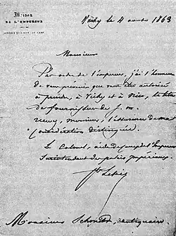 During his stay in France, which lasted from 1851 to 1869, encompassing almost the entire period of the Second French Empire,[17] Schmidt-Ciążyński arrived in Paris on the eve of Louis Napoleon's December coup d'état, which soon led to his becoming Napoleon III. This period marked significant political changes posing serious threats to landowners. Valuable works of art were available on the antique market for small sums, as their owners considered leaving the capital or even the country. Konstanty Schmidt-Ciążyński wisely invested his funds from Russia, significantly enriching his collections (again, through several trips across Europe) and establishing an antique shop (named Schmidt Antiquaire at 3 Quai Voltaire, with branches in Vichy and Nice),[17] which soon gained great renown, attracting even crowned heads as clients. Napoleon III himself appointed Konstanty Schmidt-Ciążyński as a supplier to the court in 1863.[18]