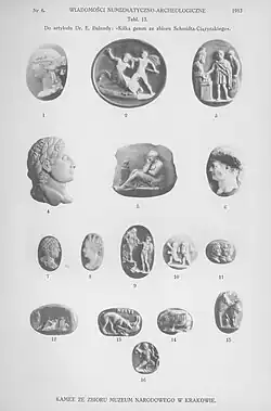 On 5 August 1883, Schmidt-Ciążyński arrived in Kraków with his engraved gem collection (and the remaining part of his collection).[40] The first public display of the collection took place in the Kraków Cloth Hall during the inauguration of the museum's exhibition of artifacts from the time of John III Sobieski on the 200th anniversary of the Battle of Vienna.[41] This exhibition was opened on 11 September 1883.[42] In the following days, successive engraved gems from Schmidt-Ciążyński's collection were unpacked and displayed.[43] The gem collection was presented in six cabinets, each containing 12 to 20 panels, with jewels arranged in the manner used by numismatists. In addition to the panels, various other objects of ancient art were exhibited. These included: enamel, Egyptian excavations, miniatures, cups, etc., as well as carved stones, such as Babylonian and Assyrian busts and gems, Babylonian and Phoenician cylinders, Greek and Roman bas-reliefs, Egyptian, Greek and Etruscan scarabs, and amulets (talismans) in various Eastern languages, vessels, vases, etc., carved deeply into stones, animals similarly represented as Greek and Roman relics, Greek and Roman gold, silver, iron, and bronze rings; Gnostic stones (abraxas gems) from the early Christian centuries, religious objects from the Middle Ages; coats of arms of distinguished European families carved in precious stones, and finally, proper gems (including masks and chimeras) such as cameos and intaglios, Greek, Roman, Renaissance, as well as the newest from the 18th and 19th centuries.[44]