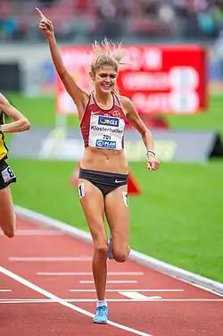 Konstanze "Koko" Klosterhalfen (born 18 February 1997)[2] is a German middle- and long-distance runner. She is the 2019 World Championship bronze medallist and 2022 European champion in the 5000 metres, becoming the first German medalist of the event at the World Athletics Championships and the first German winner of the event at the European Athletics Championships. At the European Indoor Championships, Klosterhalfen won silver medals for the 1500 metres in 2017 and the 3000 metres in 2019 and 2023. She took four individual medals at the European Cross Country Championships. In February 2020, she set a European indoor record in the 5000 m with 14:30.79, the fourth fastest time ever.