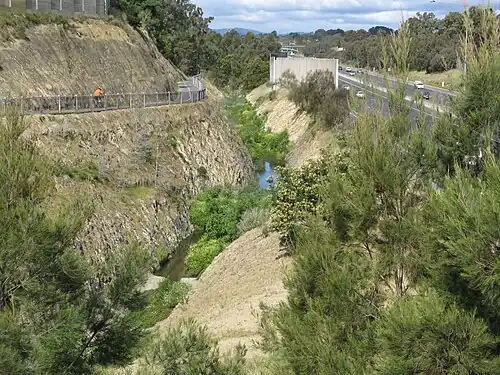 The Koonung Creek (center) since its diversion for the construction of the Eastern Freeway (right) and the Koonung Creek Trail (left)