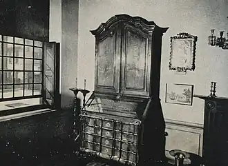 The house contains several armoires, of which Dorothea Fairbridge,[26] believes the finest is a rococo cabinet (height 270 cm, width 220 cm, depth 72 cm) of stinkwood with amboyna. It is gable-topped with flat spaces on which would have been placed blue Nankin or Delftware garnitures. It rests on claw feet and retains its original silver escutcheons and handles by Daniel Heinrich Schmidt, a Cape silversmith. The handles date the cabinet to between 1780 and 1790.[28] This cabinet might be one of three that belonged to Hendrik de Wet at the time of his death in 1802,[28] but it was certainly in its present upstairs bedroom location when Margaretha de Wet died.[26] The armoire, listed in the 1913 sale catalogue as lot 2308, was purchased for £100.[20]