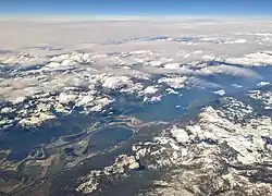 Kootenay Lake was formed through river erosion and, later, glaciation. The erosion began during the late Cretaceous until ice filled the resulting valley in the Pleistocene.[4] When the valley was filled with ice, glaciers from the mountains (the Selkirks and Purcells) fed the valley's ice mass. The glacier that occupied what is now the west arm of Kootenay Lake flowed into the Kootenay ice mass. As the ice melted from this glacier, drainage flowed over an area near what is now Nelson, causing the west arm of the lake to drain toward the west. A large moraine formed near what is now the large bend in the Kootenay River near Libby, Montana. As ice melted, a lake formed behind the moraine and drained southward over top of it. The southerly drainage over the moraine eventually stopped and the Kootenay River began to follow its present course.[4]