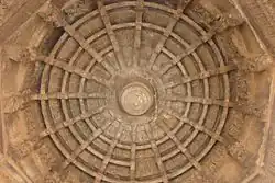 The Mahadeva temple at Itagi dedicated to Shiva is among the larger temples built by the Western Chalukyas and perhaps the most famous. Inscriptions hail it as the 'Emperor among temples'.[10] Here, the main temple, the sanctum of which has a linga, is surrounded by thirteen minor shrines, each with its own linga. The temple has two other shrines, dedicated to Murthinarayana and Chandraleshwari, parents of Mahadeva, the Chalukya commander who consecrated the temple in 1112 CE.[11] Soapstone is found in abundance in the regions of Haveri, Savanur, Byadgi, Motebennur and Hangal. The great archaic sandstone building blocks used by the Badami Chalukyas were superseded with smaller blocks of soapstone and with smaller masonry.[12] The first temple to be built from this material was the Amrtesvara Temple in Annigeri in the Dharwad district in 1050 CE. This building was to be the prototype for later, more articulated structures such as the Mahadeva Temple at Itagi.[13] The 11th-century temple-building boom continued in the 12th century with the addition of new features. The Mahadeva Temple at Itagi and the Siddhesvara Temple in Haveri are standard constructions incorporating these developments. Based on the general plan of the Amrtesvara Temple at Annigeri, the Mahadeva Temple was built in 1112 CE and has the same architectural components as its predecessor. There are however differences in their articulation; the sala roof (roof under the finial of the superstructure) and the miniature towers on pilasters are chiseled instead of moulded.[14]