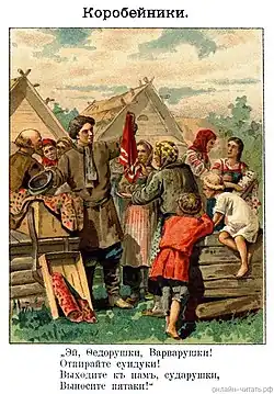 In its poetic preamble, Nekrasov dedicated the poem to Gavrila Zakharov, his peasant friend and a regular hunting companion who had prompted him the storyline of the poem.[4] According to the memoirs of Nekrasov's sister Anna Alekseyevna, her brother wrote the poem in his home village, right after returning from a hunting trip.[2] Prior to its appearance in Sovremennik, "Korobeiniki" was published in the Red Books series started by Nekrasov specifically for the peasant readership; these books were distributed by the "ophens", vagrant traders, in the rural areas of Russia.[5]