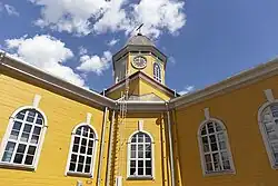 The first church in Korpilahti was a modest church hut that was erected in the late 17th century on a spot next to the harbour where the military cemetery is now located. The exact year of its construction is not known, but the church bell that was installed shortly thereafter dates back to 1701. A second church building was erected on the same spot next to the Kirkkolahti “Church Bay” in the 1750s. In 1753 itinerant church-builder Arvi Junkkarinen (1716-1777) of Leppävirta began construction of cruciform church, which was completed on the same site by 18th-century master carpenter Jaakko Leppänen in 1764 and 1765,[1] Leppänen's son, also named Jaakko (1741-1805), made a separate wooden church belfry in 1777.[2] The lower part of the belfry is a remnant of this church building. The building later served as a grain warehouse and now houses the local history museum.