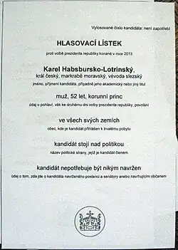- ^ "Plzeňan hlasoval pro dědice Habsburků, lístek si vyrobil sám". Mladá fronta DNES. 26 January 2013. Retrieved 31 July 2019.