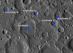 By convention these features are identified on lunar maps by placing the letter on the side of the crater midpoint that is closest to Kostinskiy.