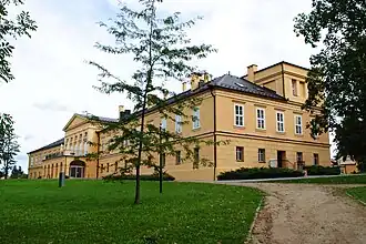 The palace is surrounded by an extensive English landscape park established in the mid-19th century.[6] In its western section, there is a picturesque pond. The park features small-leaved linden trees, chestnuts, maples, common beeches, sycamores, tall ash trees, and pedunculate oaks. Some exotic trees also grow here, including the Eastern white pine, Canadian and black pine, Canadian hemlock, London plane tree, and American ash. Many of these trees are designated as natural monuments.