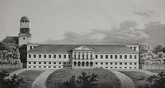 After passing through multiple owners, the estate was acquired in 1804 by the Prussian general Frederick Louis, Prince of Hohenlohe-Ingelfingen (1746–1818).[1] He had already gained possession of the Sławięcice (German: Slawentzitz) estate in 1782 through his marriage to Countess Amalie von Hoym and resided there.[1] His son, Adolf Karl Friedrich Ludwig, Prince of Hohenlohe-Ingelfingen (1797–1873), also served in the Prussian military and briefly held the position of Minister President of Prussia.[1] Between 1828 and 1830, he commissioned the construction of a new neoclassical palace in Koszęcin, incorporating older elements from the 17th century.[1] The design was created by the architect Albert Roch from Berlin, and the work was supervised by the architect Friedrich Wilhelm Degner.[2] The cornerstone was laid on 22 August 1828, the birthday of princess Louise, Adolf's wife.[2] The scope of work included the demolition of the southern wing and the transformation of the west wing in the central part, for which a new main entrance to the palace was designed from the park side, topped with a triangular tympanum. At the ends of the wing, two flanking avant-corps were added, on which there were originally observation decks.[2] The reconstruction also included the facades, which were given classicist features.[2]