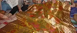 Since the weavers had come from Mysore, the fabric produced was called kota masuriya. It was woven on narrow 8 inch looms to make the traditional paags (turbans) and later on broader looms used for gossamer light saris.[2] Silk was added to the cotton in a 20:80 ratio approximately to give the sari strength. This has become the usual cotton silk Kota Doria blend. Nowadays hand woven silk Kota Doria saris have also become popular. At first the design known as a buti was small and regular but larger designs are now made according to fashion and taste. A standard sari is 6.5 metres long and includes the blouse piece. A very ornate sari can take one month to make and is an heirloom piece to be treasured. A genuine Kota Doria sari will contain the GI mark woven in one corner indicating that it has been hand woven using real silver and gold thread.