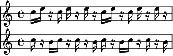 Kotekan are typically composed by elaborating the pokok melody. The subdivisions of the composite kotekan are usually played four or eight times faster than the pokok. Since the kotekan patterns are either three notes (telu) or three sounds (the kotekan empat has two solo pitches plus the open interval), the simple patterns do not repeat every four or eight notes. This can be illustrated in the following example: