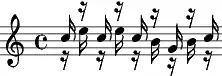 Kotekan are "sophisticated interlocking parts,"[2] "characteristic of gong kebyar and several other Balinese gamelan styles, that combine to create the illusion of a single melodic line that often sounds faster than any single human could possibly play."[3] According to Colin McPhee: "Composed of two rhythmically opposing parts which...interlock to create a perpetual flow of sound, the kotekan adds sheen and intensity to the music, ...calls for the utmost rhythmic precision...[and] lies in the top register of the gamelan."[4]