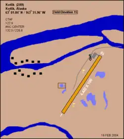 Kotlik Airport (IATA: KOT[3], ICAO: PFKO[4], FAA LID: 2A9) is a state-owned public-use airport located one nautical mile (1.85 km) west of the central business district of Kotlik, a city in the Kusilvak Census Area of the U.S. state of Alaska.[1]