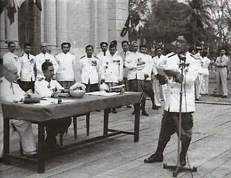 Speech of the Prime Minister Phoui Sananikone during the effective transfers of powers, on April 13, 1950. Standing, 4th and 5th from the left, Chao Souvanna Phouma and Kou Voravong.