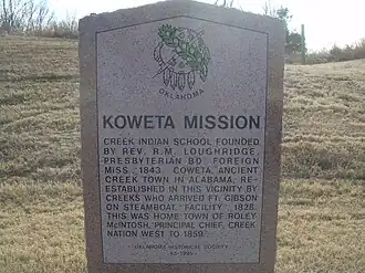 Koweta Mission Site is a site near Coweta, Oklahoma, and listed on the National Register of Historic Places. The mission was started in 1843 by Presbyterian minister Robert Loughridge at Coweta, then the capital of the Creek Nation, Indian Territory. He named the mission "Koweta", after the Creek capital. [1] The school operated until the American Civil War, when Loughridge and most missionaries left the territory.