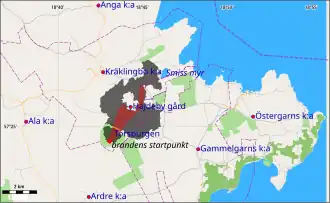 The early summer of 1992 was unusually warm with little rain, leaving the ground extremely dry.[21] On 9 July there was a moderate gale of about 7 on the Beaufort scale, coming from the south. The fire, probably started by a burning cigarette,[22] started in the southern part of Torsburgen, a couple of hundred meters north of the Arde opening.[12] The fire spread rapidly and soon developed into a canopy fire. Due to the wind a fire storm, about two kilometers wide, formed and advanced north toward Hajdeby farm and Kräklingbo church.[19] The fire had three fronts. Two flanks, each approximately 6 km (3.7 mi) wide, slowly spreading outwards and a 2.5 km (1.6 mi) wide front advancing very rapidly in the north.[19]