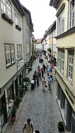 The construction of the houses on the Krämerbrücke was completed in 1486, following a fire in 1472 which destroyed nearly half of the city and the market stalls on the stone bridge.[3][5] Sixty-two timber-framed buildings were built on each side of the stone bridge, creating a street between the two rows.[5] Later, the small houses were gradually merged, so that there are now 32 houses on the bridge. They have shops on the ground floor and living accommodation above.[7] They are the longest rows of inhabited buildings on any bridge in Europe.[8]