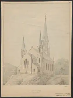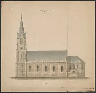 By the 1860s, the town of Kragerø had grown to a population was nearing 5,000 people, so the church was no longer large enough for the parish. The new church was built a little to the east of the old church yard after some other buildings were torn down. The new church was designed by Georg Andreas Bull. On 23 September 1870, it was consecrated by Bishop Jacob von der Lippe. The new building is a long church built out of yellow-colored brick. The church is located on an embankment and is clearly visible from the sea, particularly noticeable are the large bell tower and the two small towers by the choir. The choir is surrounded by vestries. At the dedication, the church had room for approximately 800 people. This was too small, and it is said that the architect reluctantly agreed to design second floor seating galleries for the church, so that the capacity was increased by 300 to 1,100 seats in 1878. For the church's 125th anniversary in 1995, the galleries were removed, except the organ gallery in the back of the church. Throughout the church's history, there have been quite a few problems with the brick, which has not withstood the climate very well. It has been necessary to replace parts of the facade over the years.[4][5]