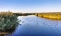 With a drop of 0.5 m per km, the river is gently flowing. The width of its valley is 3.5 km. The right bank is high, up to 60 m in places, and cut by short but deep ravines. The flat left bank is lower, less than 30 m high and gently cut by tributary streams.