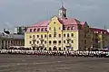 The last name that is most common is Red Square. The origin of the word "red" is not from the color of the pavement, which the center has been covered since 1935, but from the Slavic adjective "red, which means beautiful." On the map of the city, dated 1930, you can find the name "Red Square" in Ukrainian. Locals are accustomed to calling the center by any of the above.[3] Always in the same year after a major reconstruction of the square from which the city bazaar was removed, and in order to honor the memory of the late Bolshevik functionary V. Kuibyshev, the square was named after him. In December 1941, the square was named after Hetman I. Mazepa. Mazeppa Platz, and in the fall of 1943 the previous name was returned - Kuibyshev Square.The area where the square is located today has been the main market of the city since the times of Russia. Later, when Chernihiv after the destruction of the Tatar-Mongols significantly decreased in size, trade was conducted on the territory of the fortress, and after its liquidation, in 1799, again moved to the area, which at that time was referred to as the Friday Field; later the area was named Bazarnaya, then - Krasnaya. From the middle of the 19th century. part of the square was designated as Theatrical.At the beginning of the 19th century on the square built shopping malls with colonnades-galleries, in which local merchants opened their shops. The shopping malls were dismantled in the first half of the 1930s, and in 1935 the square, like all the main streets of the city before that, was paved with red and yellow clinker, and a square was laid out near the Friday Church. In 1959, the Chernihiv Regional Academic Ukrainian Music and Drama Theater named after Taras Shevchenko was opened on the square.[4]