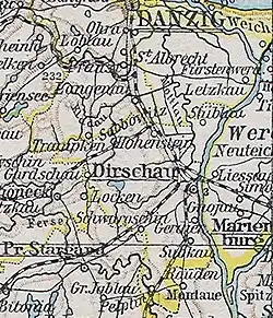 West Prussia became part of the Kingdom of Prussia through the First Partition of Poland in 1772 and was initially divided into six large districts, including the Dirschau district.[1] The northern part of Pomerelia with the towns of Dirschau, Neustadt, Putzig and Stolzenberg were part of the Dirschau district.[2]