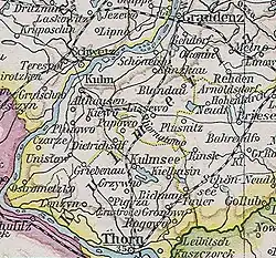 The area of the Kulm district became part of Prussia after the First Partition of Poland in 1772. The district covered most of the historic region of Chełmno Land.[1] On 30 April 1815 the area became part of the new Marienwerder administrative region of the province of West Prussia. As part of a comprehensive district reform, the old Kulm district was significantly reduced in size on 1 April 1818. The southern parts of the Kulm district formed part of the new district of Thorn and the northern parts formed the new district of Graudenz. The district of Kulm now included the towns of Kulm and Briesen.