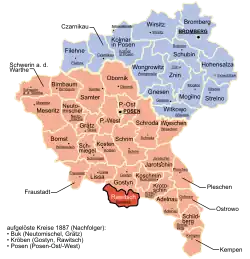 According to the Prussian census of 1910, Kreis Rawitsch had a population of 50,523, of which 42% were Germans and 58% were Poles.[1] A large part of the German population left the district after 1919, when it became part of Poland.