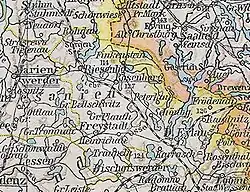 After the First Partition of Poland in 1772, the area of the future Rosenberg district was assigned to the newly created province of West Prussia as part of the Marienwerder district. As part of a comprehensive district reform in Regierungsbezirk Marienwerder, the new Rosenberg district with the capital at Rosenberg in Westpreußen was formed on 1 April 1818 from the eastern part of the Marienwerder district. The district included Bischofswerder, Deutsch Eylau, Freystadt, Riesenburg and Rosenberg.[1]