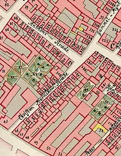 Barnikow's former property remained the by far largest property in the narrow street. It was listed in the new cadastre of 1756 as No. 45 in Købmager Quarter, owned by restaurateur Johan Georg Egner. The smaller corner property on the other side of the street was listed as No. 46 in Købmasger Quarter, owned by book binder Johan Fredeirk. The rest of the street was lined with mostly very small properties. The properties on the east side of the street were listed from north to south as No. 287–302. The properties on west side of the street (adjacent to Barnekow's former property) were listed from south to north as No. 303–309.