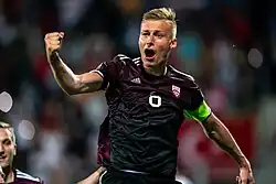 Ahead of their UEFA Euro 2024 qualifying games in June 2023, he was chosen to captain the national team, by coach Dainis Kazakevičs.[11] In his first match as captain, he scored his first international goal, the 2–2 equalizer, against Turkey.