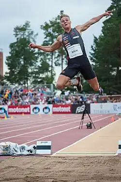 Bäck matched his best lengths in 2017, jumping 7.95 metres in Jämsä on 1 July.[8] Two weeks later he competed at the 2017 European U23 Championships, later also at the 2017 Summer Universiade, without reaching the final in either.[1] With a goal of jumping 8 metres that he deemed realistic, his first and third jump at the 2017 European U23 Championships were invalid. His second jump measured 7.53, but was marred by getting too little time to prepare, 18 seconds instead of 60; Bäck successfully handed in a protest and was allowed to redo his second jump in the evening. This, however, was an overstep and hence not valid.[9][10] After that he became Finnish U23 champion again, and won his first Finnish Championships in a wind-assisted 7.91 metres, but only finished fifth at the Finland–Sweden International.[11][12]